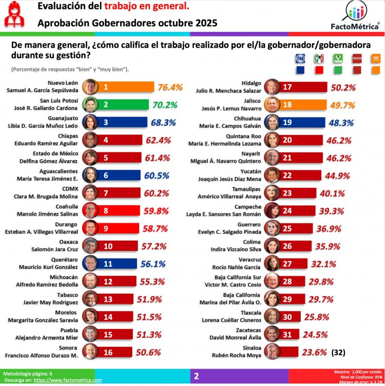 La última encuesta de gobernadores de FactoMétrica coloca a Margarita González Saravia en lugar 14 en el ranking nacional de gobernadores, con 51.5 por ciento de aprobación. El estado cae a la posición 16 en materia de combate a la corrupción y hasta el 21 en materia de inseguridad.