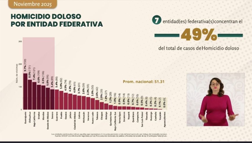 Los datos surgieron de autoridades federales durante la transmisión de la Conferencia del Pueblo, encabezada por la presidenta Claudia Sheinbaum: Morelos se ubica entre las siete entidades que concentran el 51 por ciento de los homicidios dolosos cometidos en México de enero a noviembre y es el quinto lugar a novel nacional del total de homicidios perpetrados en México el mes pasado.