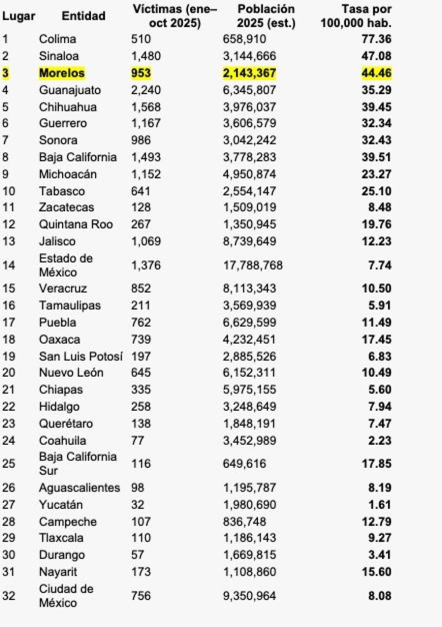 El gobierno federal a través de la Mañanera del Pueblo mostró una realidad incómoda: Morelos se mantiene entre las diez entidades del país con más altos niveles de inseguridad y entre las siete que concentran el mayor número de homicidios; en noviembre el estado ocupó el quinto lugar nacional. La información aparece justo cuando la gobernadora presume que el estado va mejor en materia de seguridad y los resultados son satisfactorios. ¿Entonces?
